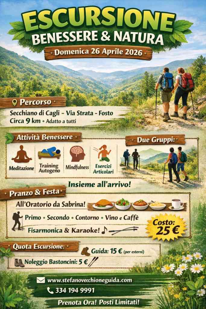 Un’esperienza completa nella natura: Secchiano di Cagli – Via Strata – Fosto – ritorno sullo stesso sentiero. Durante il percorso vivremo momenti dedicati al benessere:
