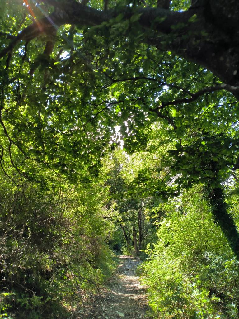 Il paesaggio cambia piuttosto radicalmente quando si raggiunge quota 450 metri, nel punto in cui il sentiero effettua una repentina svolta verso sinistra, immergendosi completamente nell’ambiente boschivo, con le pendenze che si fanno via via più marcate. In questo tratto la segnaletica è stata risistemata di recente, permettendo di mantenere agevolmente la via corretta, nonostante siano presenti diverse tracce secondarie che potrebbero indurre in errore.