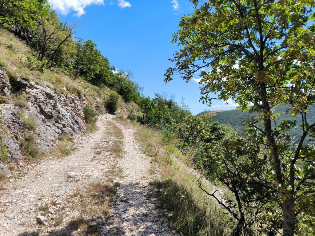 Il percorso di andata termina a quota 708 metri, quando si incrocia il sentiero 5 che sale anche lui da Piobbico, diretto verso il vicino borgo di Montiego. Nei pressi dell’incrocio si trova una “maestà” dedicata alla Santissima Vergine.